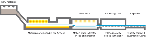 Dolomit und andere Mineralien schmelzen sie im Glasofen bei einer Temperatur von 1800 ° C, von der die Bommeln aufsteigen Glas und Verunreinigungen setzen sich unter dem Ofen ab, das Glas schwimmt auf der Oberfläche des Zinnmaterials, es verteilt sich unter der Wirkung von Schwerkraft und Spannung und bildet schließlich das flache Glas, gleichmäßige Dicke, polierte Oberfläche, keine Unebenheiten, keine Kratzer und keine Wellen, HHG-Herstellung klares Floatglas, ultra-klares Floatglas, Farbe Floatglas, sie sind Anwendung für verschiedenes vom Feld, Beispiel der Tür, des Fensters, der Möbel, des Autos und können Prozess des ausgeglichenen, lamellierten und Spiegels für Architektur oder optisch sein.