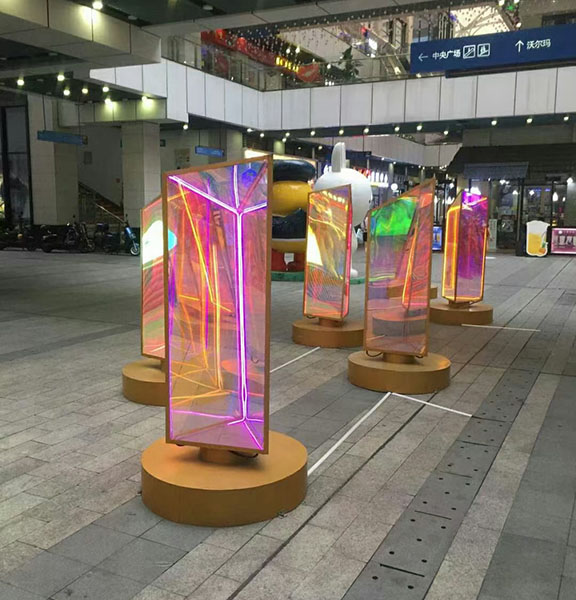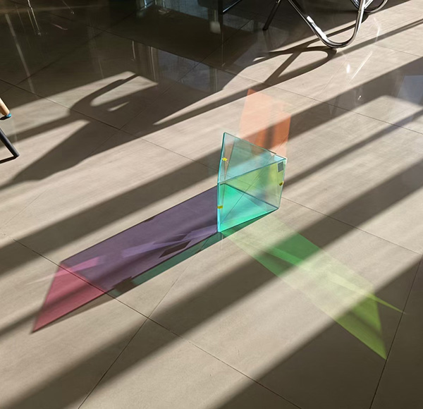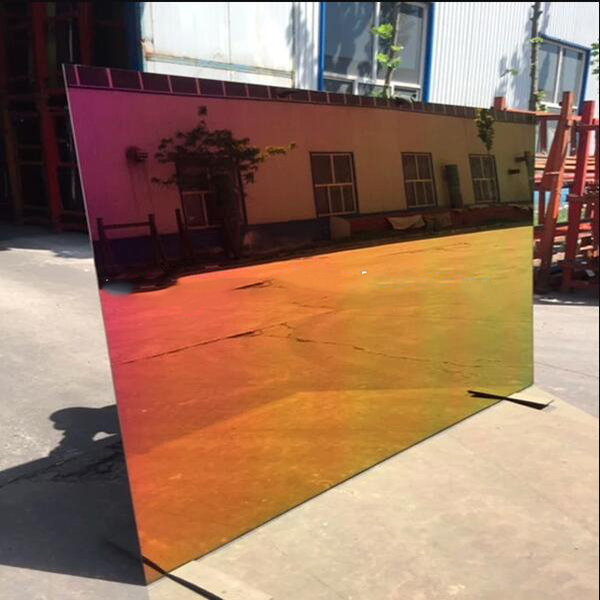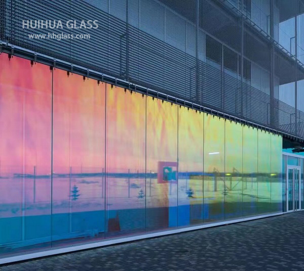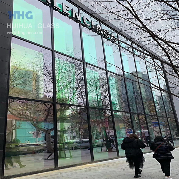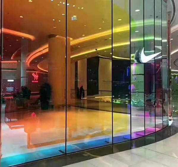 Das dichroitische Glas wird auch Regenbogen genannt Glas or buntes GlasDer Farbeffekt entsteht beim Beschichten des Metallfilms. Die Farbe variiert, wenn man sie aus verschiedenen Winkeln betrachtet. Wenn es auf Licht trifft, weist seine Oberfläche eine Farbe auf. Das durch das Glas hindurchtretende Licht erscheint jedoch in einer völlig anderen Farbe, als ob Regenbogen verrieben und eingemischt, mit dem Sehsinn kann ein solches Material monochromatisches Licht in Licht mit einer Vielzahl von Farben zerlegen. Und aus verschiedenen Blickwinkeln betrachtet sind die erhaltenen Farben unterschiedlich und wirken wie ein Webstuhl, was Architekten mehr Möglichkeiten für Glasoptionen bietet . Als Hauptfarben können drei Arten von Farben angeboten werden: Blau, Orange und Grün. Sie können sich für jedes beliebige Ihrer Gebäude bewerben.