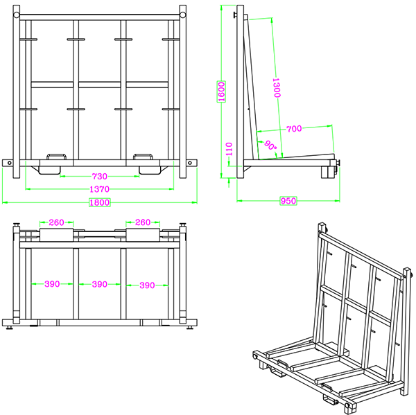 2. Length 1800*Height1600*width950mm, effective glass‐storing thickness reaches 690mm, suitable for middle truck transport.
