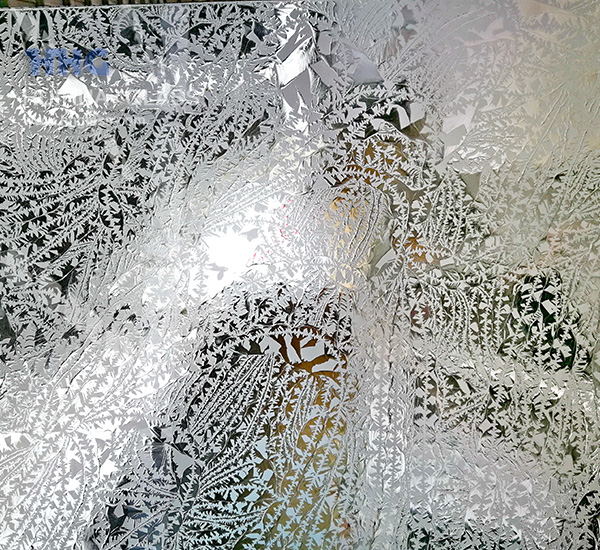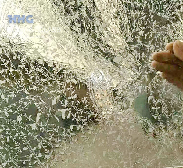 Chip kleben Glas Diese attraktive, zufällige Textur entsteht durch Auftragen von heißem Tierkleber auf das Milchglas und durch Trocknen unter kontrollierten Temperatur- und Feuchtigkeitsbedingungen. Während es trocknet und sich zusammenzieht, schrumpft und kühlt der Klebstoff und entfernt Flocken von Glas von der Oberfläche in zufälliger Weise gemustert. Die spezielle Technik des Klebe-Chip-Glases ermöglicht es, dass jedes Design anders ist. Die Technik des Leim-Chip-Glases kann sowohl für klares oder getöntes Glas als auch für Spiegel verwendet werden. Es wurde seit dem frühen 20. Jahrhundert gelegentlich in Schildern und in Buntglasfenstern verwendet. Heute ist es sehr beliebt für Fenster, Türen, Schränke und Hintergrund und ist besonders schön in Kombination mit Fasen und Fasengruppen. Wenn zusätzliche Stärke benötigt wird, muss temperiert werden.