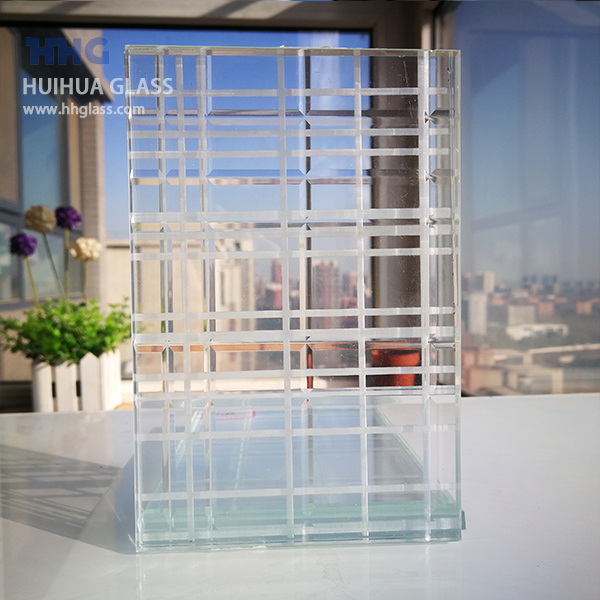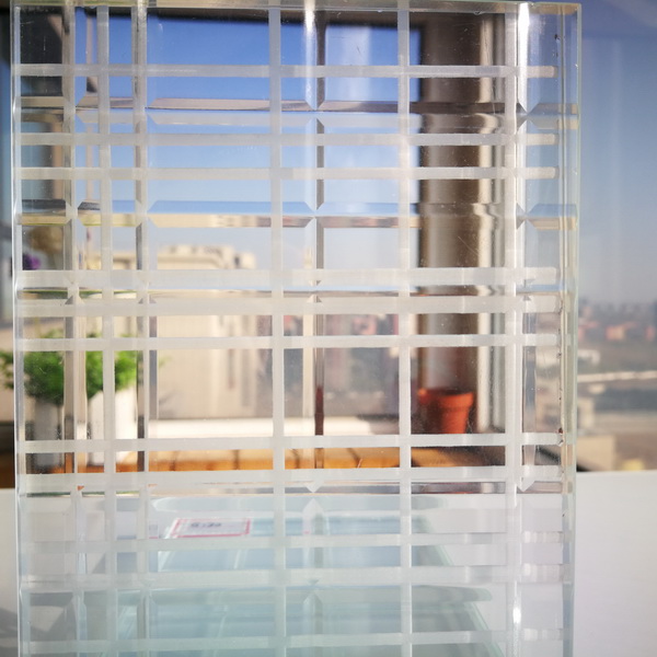 Bild 1 ist geätzt Kreuzlinien eine Float Glasscheibe, es könnte mit Carve Glas machen in Verbundglas wird schön sein, könnte auch einzelne Glaseinsatz für Glasur, folgen Sie Bild der Verbundglas ist mit einem Stück machen Frostlinienglas und ein Stück poliert Glas schnitzen,