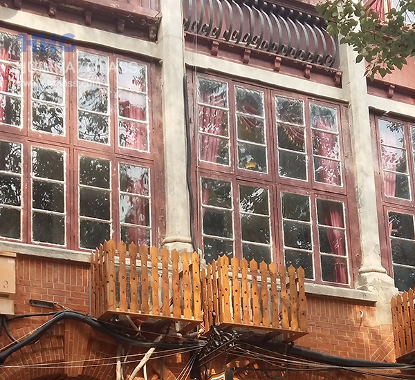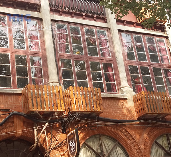 Altes Fenster reparieren Glas passend zu einem antiken Gebäude aus dem Jahr 1925, lebhaft mit Verzerrungen oder Samen, können wir Bewegung im reflektierten Licht auf dem Glas sehen, wenn wir auf der anderen Straßenseite sind. Schwimmendes glas ist flach und leblos und kann in alten Gebäuden nicht mithalten.