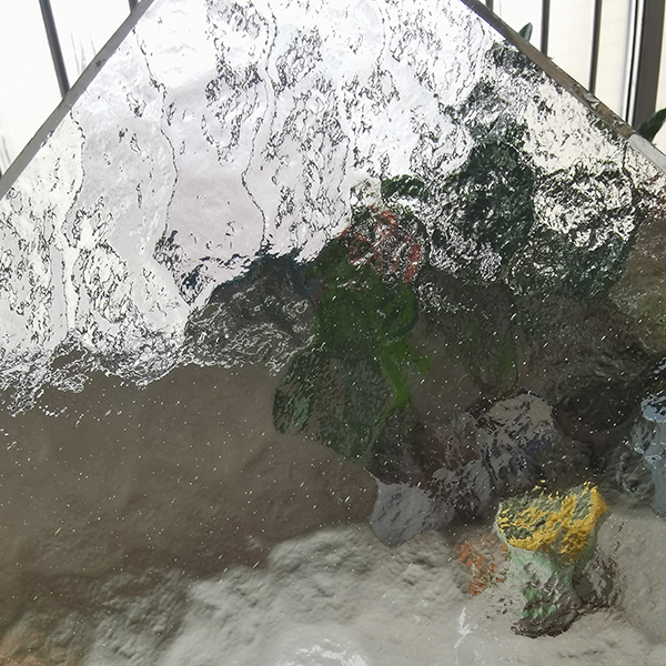 Antikes Aqualite sieht aus wie eine Felsoberfläche oder eine Meereswelle mit zusätzlichen Blasen im Glas und wird normalerweise für Fenster für Fenster der alten Welt oder zur Herstellung von Tischplatten, Schreibtischen am Sandstrand usw. verwendet.